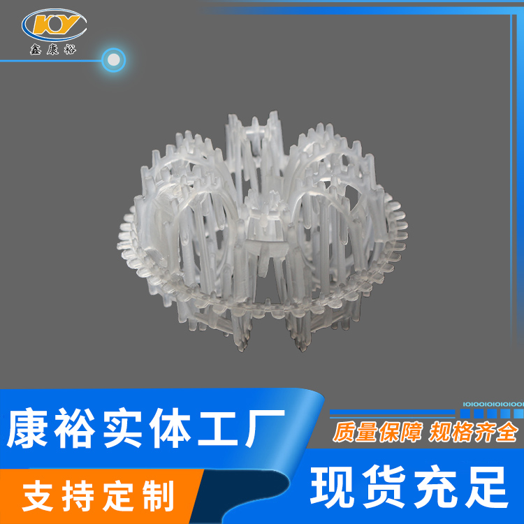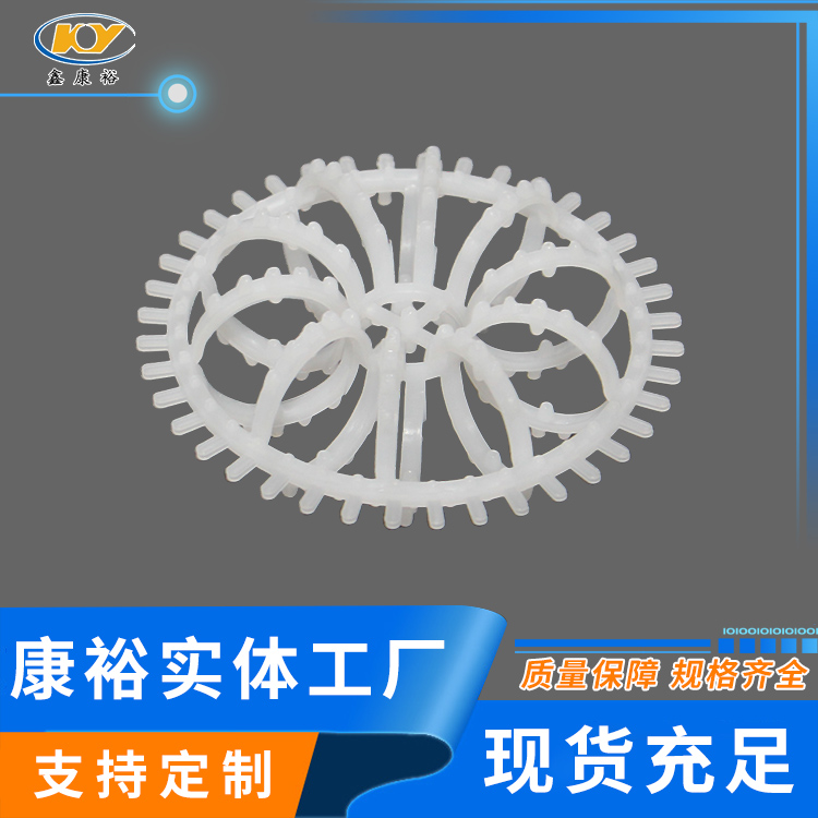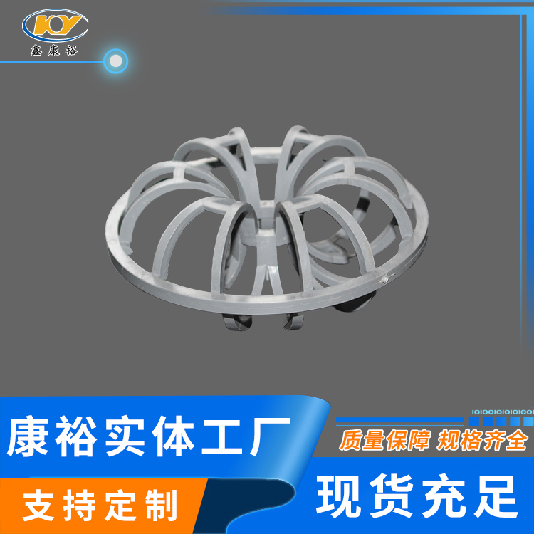 塑料花環(huán)填料早是由美國A.J.Teller于1954年研制開發(fā)出來的,故而常稱之為泰勒花環(huán)(TellerRosette)。由于填料的空隙處能有較高的持液量,可使塔內液體的停留時間較長,從而增加了氣液兩相的接觸時間,提高了填料的傳質效率。 花環(huán)填料也稱梅花環(huán)填料塑料花環(huán)填料是由12個小圓環(huán)按徑向排列而組成的一個大扁球體,很類似于一個螺旋形彈簧首尾相接繞成的一個圓球體。有的小圓呈A字;有的在小圓和大圓邊沿還帶有齒;有的外圍沒有大圓圈,只有里面的小圓組成等,客戶可根據(jù)各自的要求訂購不同種類的花環(huán)。